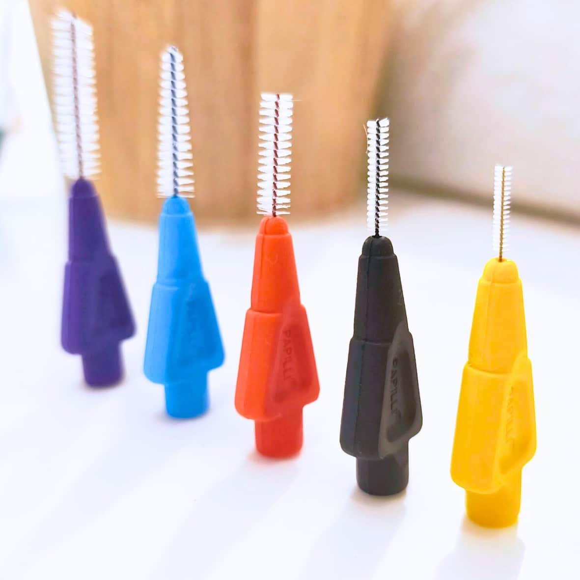 Ce pack découverte contient toutes les 5 tailles de brossettes Proxi, Yellow extra-fine, Black fine, Red Large, Blue Large conique et Purple Extra large.